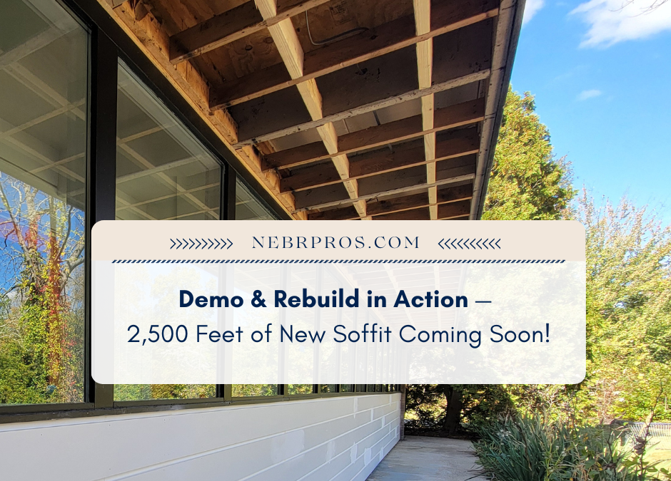 Once this 2,500+ ft soffit project wraps up, we’ll share final photos showcasing the completed rebuild. For now, you can see our demo and installation progress in the photos below — a behind-the-scenes look at what goes into large-scale exterior remodeling done the right way.